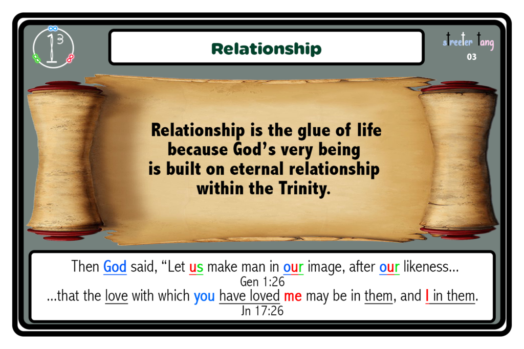 You were created for relationship because God is relationship. Loneliness, isolation, or broken relationships hurt so deeply because they go against the core of who you (and God) are. The “glue of life” is relationship, starting with your relationship with God, then with others.